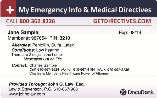 The DocuBank Emergency Card makes your advance directives immediately accessible 24/7. Hospital staff can obtain your documents via fax, or print them from the DocuBank website. Along with your directives, the hospital will also receive the names and phone numbers of your emergency contacts and primary care physician. The card also lists allergies and medical conditions to help doctors provide you with the best treatment.
